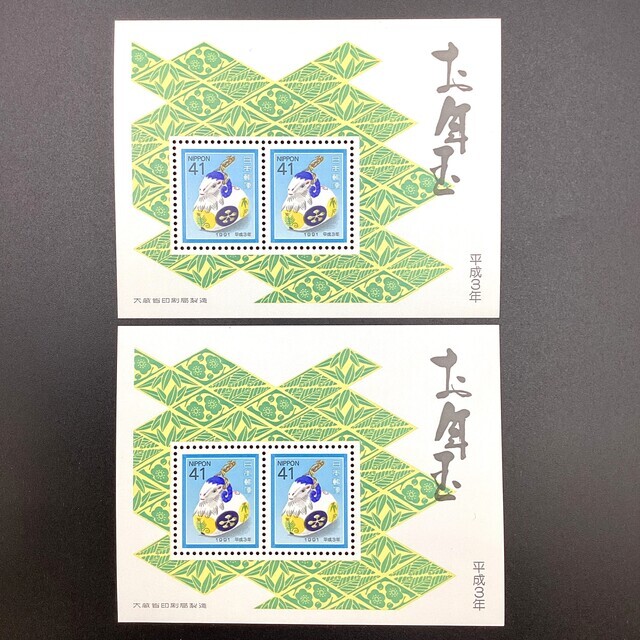 【お年玉小型シート 平成3年 2枚セット 『41円切手 未年 羊鈴』】