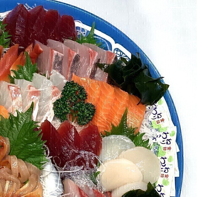 ​◉原 産 地:ほたて貝柱(宮城)、水ダコ(北海道)、ツブ貝(アイルランド)、ホッキ貝(カナダ)、まぐろたたき(国産、台湾、他)、真鯛(愛媛)、南まぐろ(静岡)、サーモン(チリ)、炙り真鯛(愛媛)、カンパチ(鹿児島)、甘えび(デンマーク)