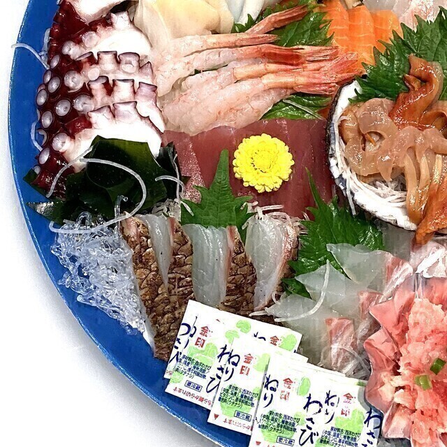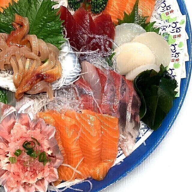 ​◉​規 格:ほたて貝柱、水ダコ、ツブ貝(解凍)、ホッキ貝(解凍)、まぐろたたき、真鯛(養殖)、南まぐろ(解凍)、サーモン(養殖)、炙り真鯛(養殖)、カンパチ(養殖)、甘えび(解凍)