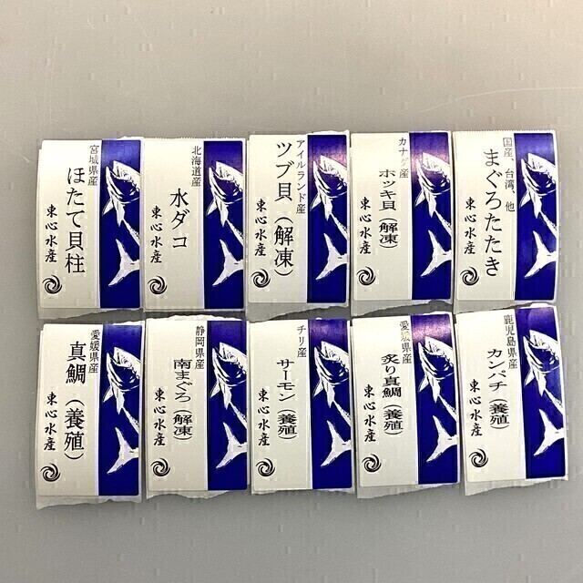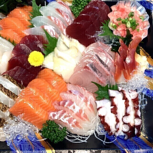 ​◉原 産 地:ほたて貝柱(宮城)、水ダコ(北海道)、ツブ貝(アイルランド)、ホッキ貝(カナダ)、まぐろたたき(国産、台湾、他)、真鯛(愛媛)、南まぐろ(静岡)、サーモン(チリ)、炙り真鯛(愛媛)、カンパチ(鹿児島)